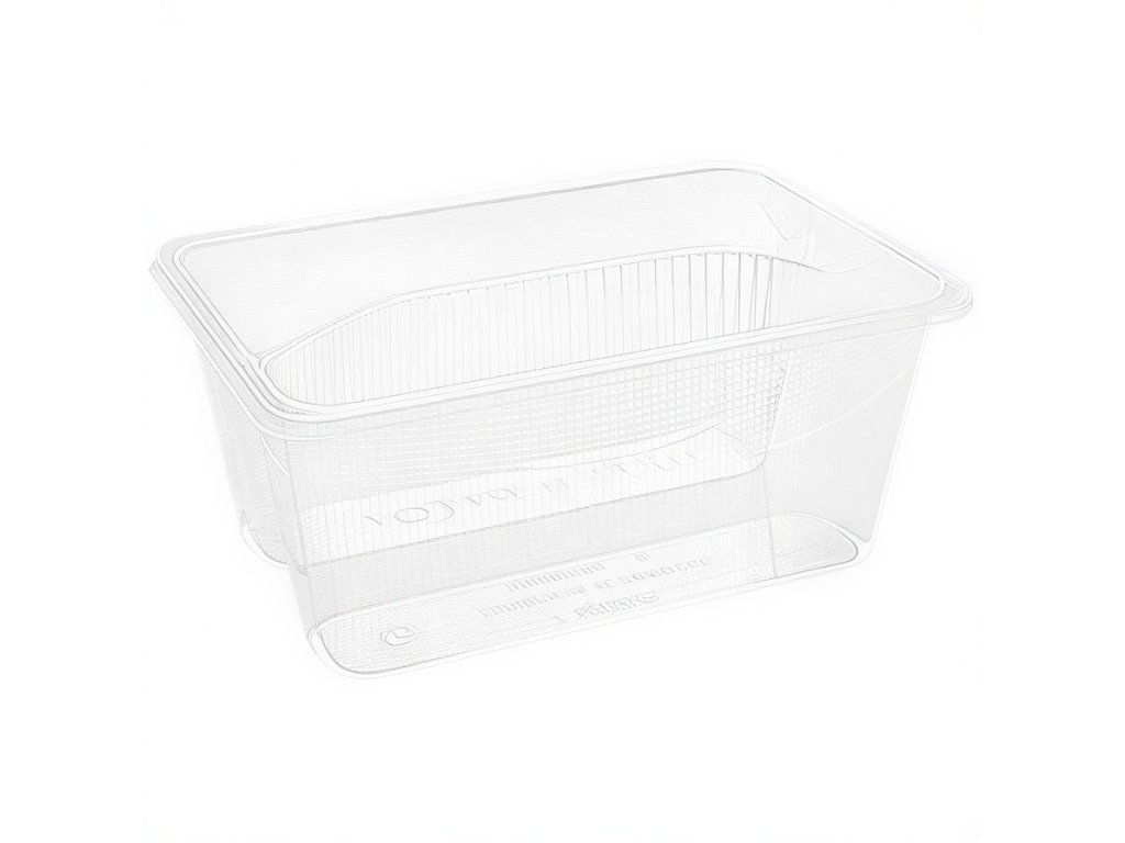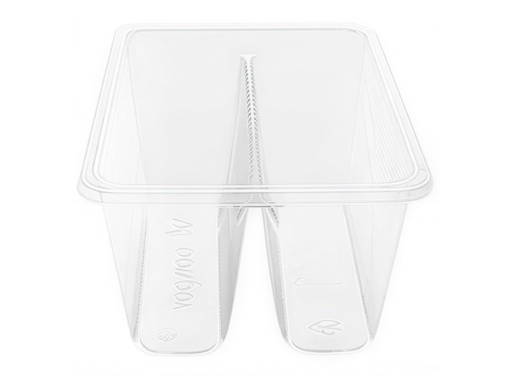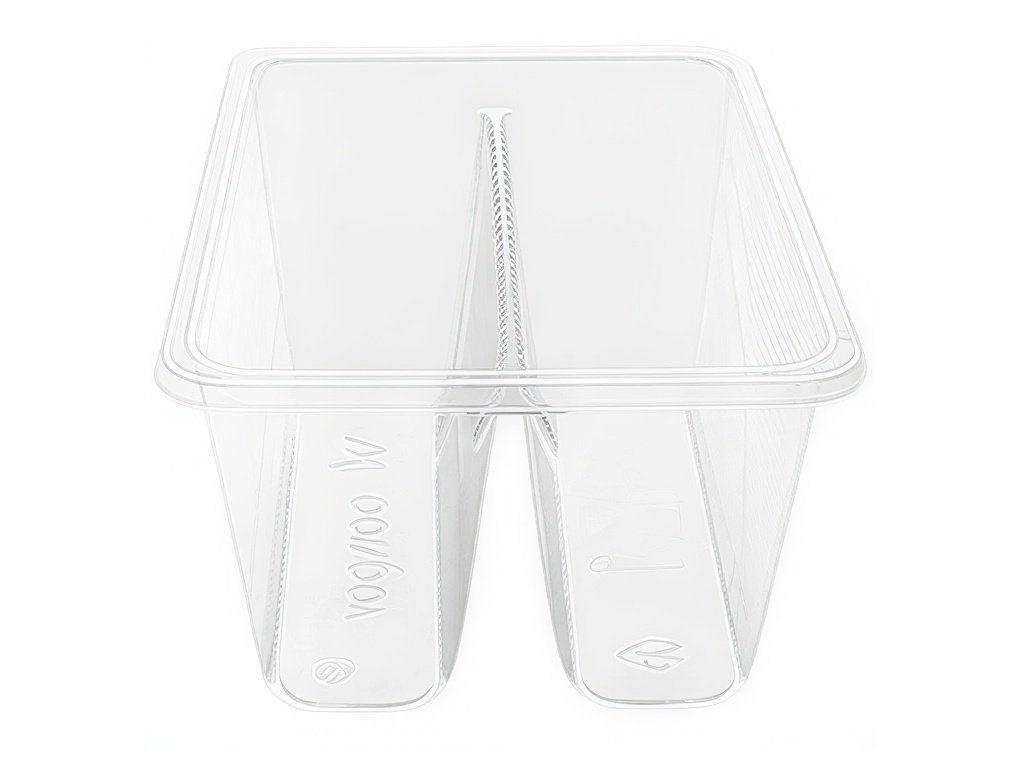 Priehľadný dvojdielny kontajner s rozmermi 15 cm x 10 cm x 6,5 cm. Vyrobený výlučne z PLA (kukuričná múka).