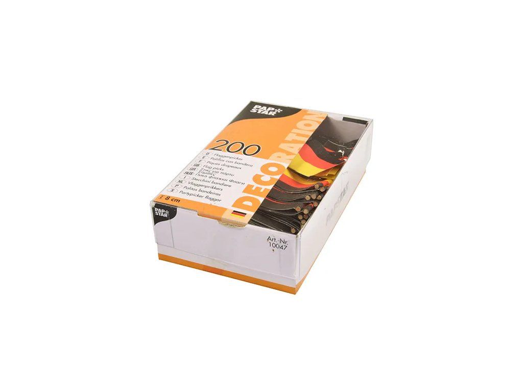 Drevené špáradlá s nemeckými vlajkami sú pútavým doplnkom k jedlám a občerstveniu. Vďaka ostrým špičkám sa dajú ľahko zapichnúť do kanapiek, koláčov alebo iných jedál a farebné papierové vlajky zdôraznia dekoratívny charakter každej udalosti. Balené v praktických krabičkách po 200 kusoch s okienkom – vždy po ruke, keď chcete oživiť svoj stôl.