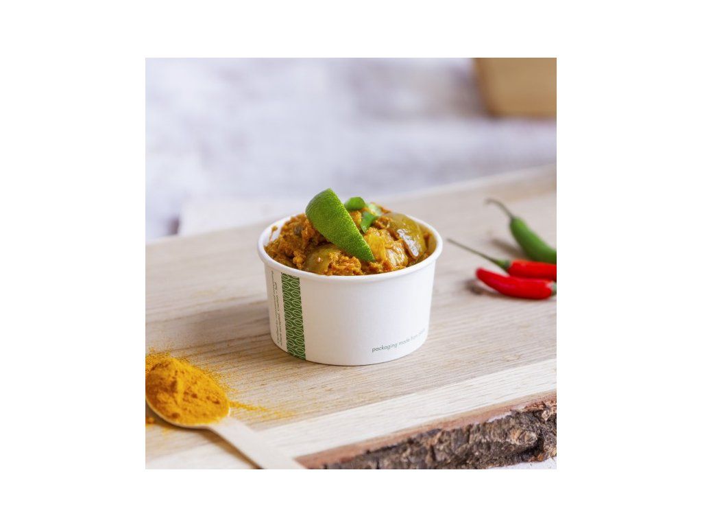 Hľadáte štýlový a ekologický spôsob, ako podávať dezerty, malé porcie polievok alebo snacky? Táto kruhová miska je vyrobená z kvalitného papiera s vnútornou vrstvou z rastlinného PLA (kukuričný škrob), ktorá zaisťuje 100 % nepriepustnosť a odolnosť voči vlhkosti bez použitia tradičných ropných plastov. Decentná potlač na miske navyše vizuálne komunikuje váš ekologický prístup k zákazníkom. Vďaka širokému hrdlu a vysokej odolnosti voči teplotám je ideálna pre teplú aj studenú kuchyňu v bistrách, kaviarňach a cateringových spoločnostiach. Misky sú plne biologicky rozložiteľné v priemyselných podmienkach. Balenie obsahuje 50 ks a predstavuje profesionálne riešenie pre modernú gastronómiu.