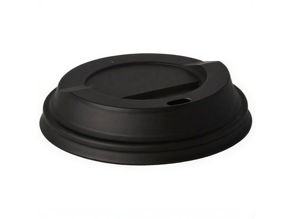 Ploché čierne viečka s priemerom 90 mm, vyrobené z C-PLA (ekologický materiál, ktorý odoláva teplotám do 90 °C).