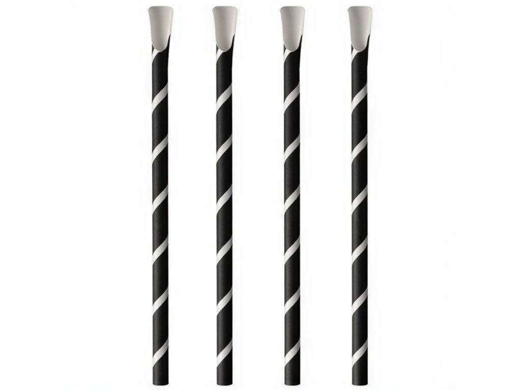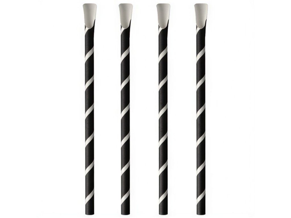 Čierno-biele papierové slamky s priemerom 8 mm a dĺžkou 20 cm, zakončené lyžičkou.