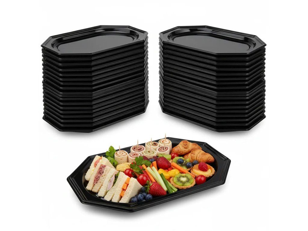 Čierne plastové cateringové tácky z rPET sú elegantným a funkčným riešením pre reštaurácie, cateringové spoločnosti a organizátorov osláv.