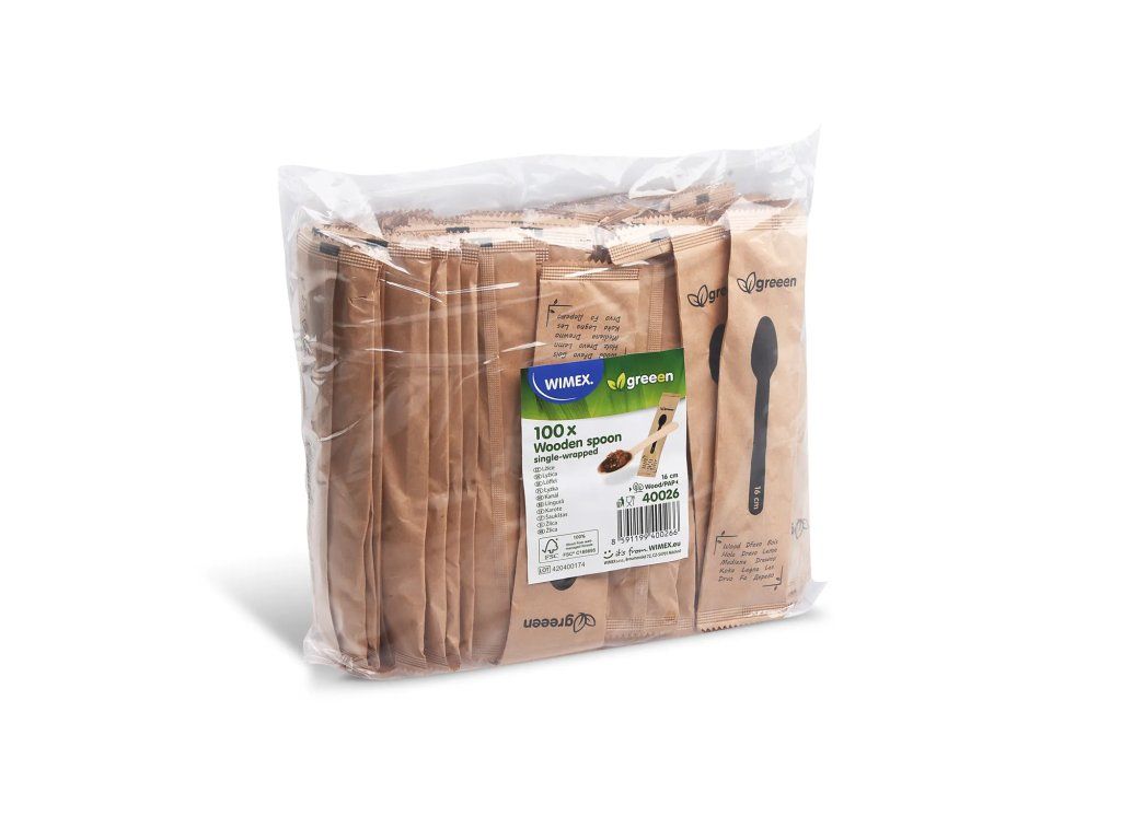 Ekologické jednorazové drevené lyžice v papierových vrecúškach Wimex, 16 cm, 100 ks.