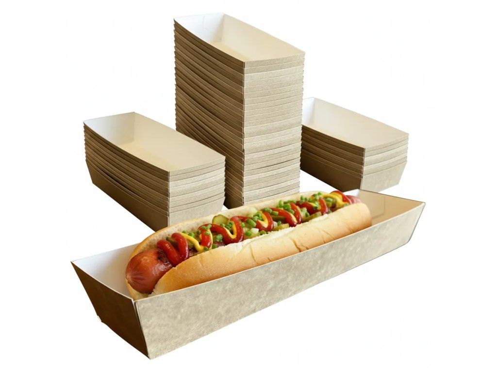 Hlboké kartónové tácky s rozmermi 26 × 5 × 3,5 cm sú určené na podávanie hot dogov.