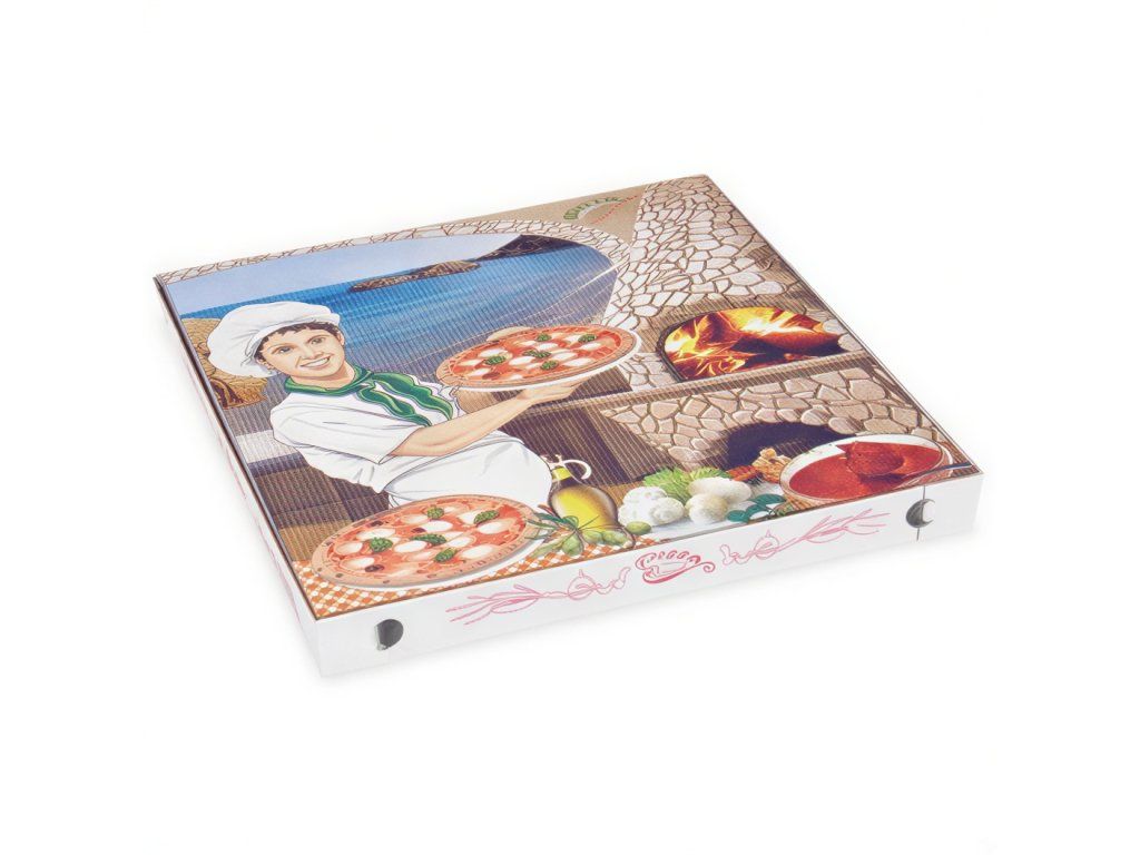 Potlačené krabice na pizzu. Rozmery: 32,5 cm x 32,5 cm x 3 cm.
