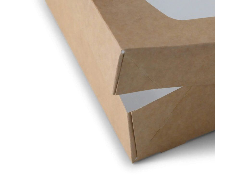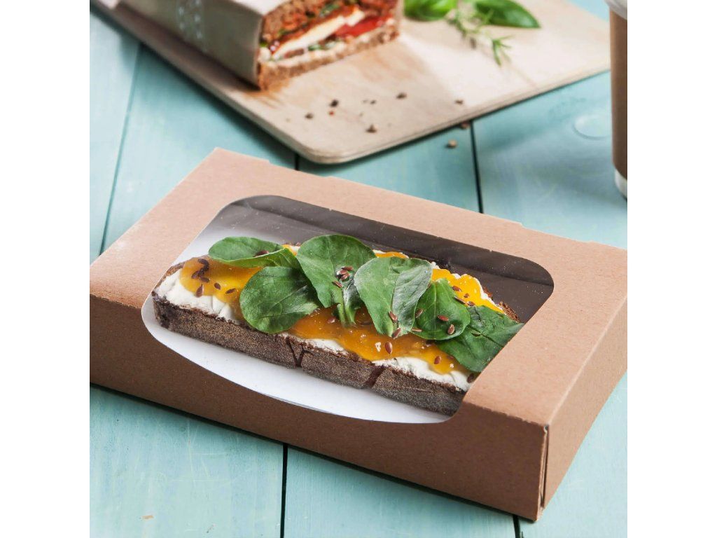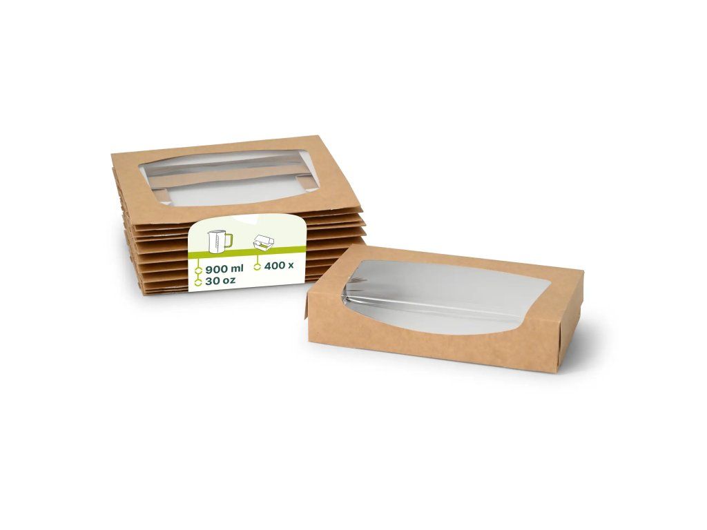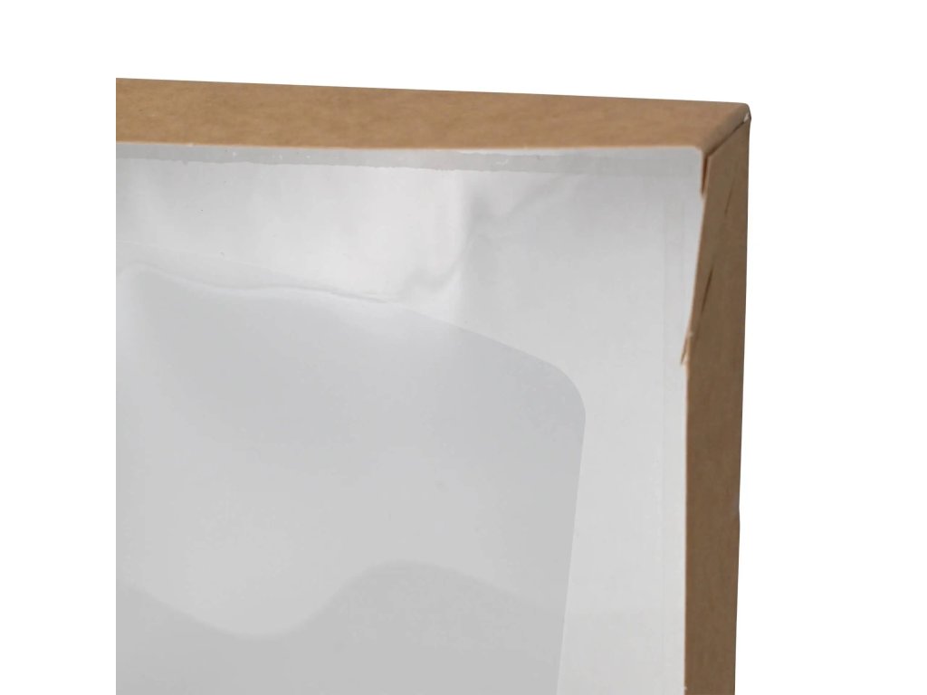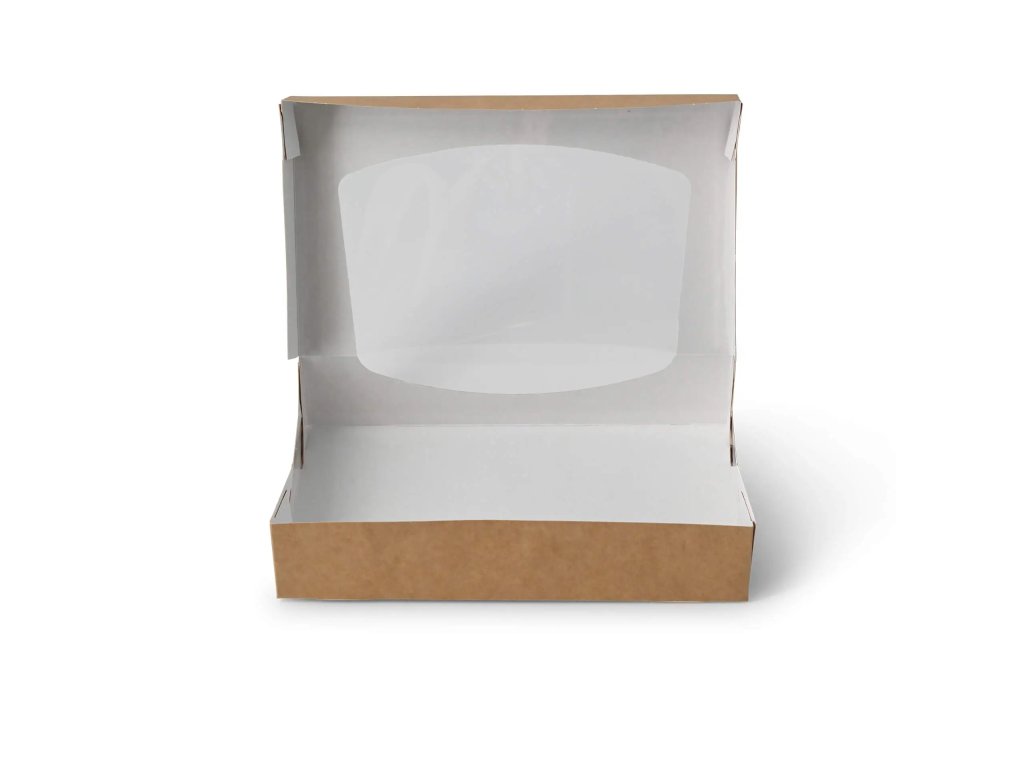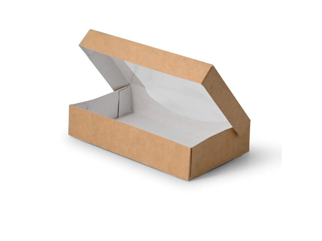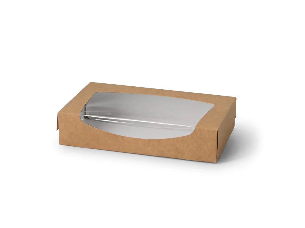 Papierová krabička na sushi s rozmermi 20 × 11,7 × 4 cm s priehľadným okienkom z celulózy. Ideálna na servírovanie sushi, snackov a sladkostí. Plne biologicky rozložiteľná, estetická a praktická na použitie. Objem cca 900 ml. Hromadné balenie: 50 ks.