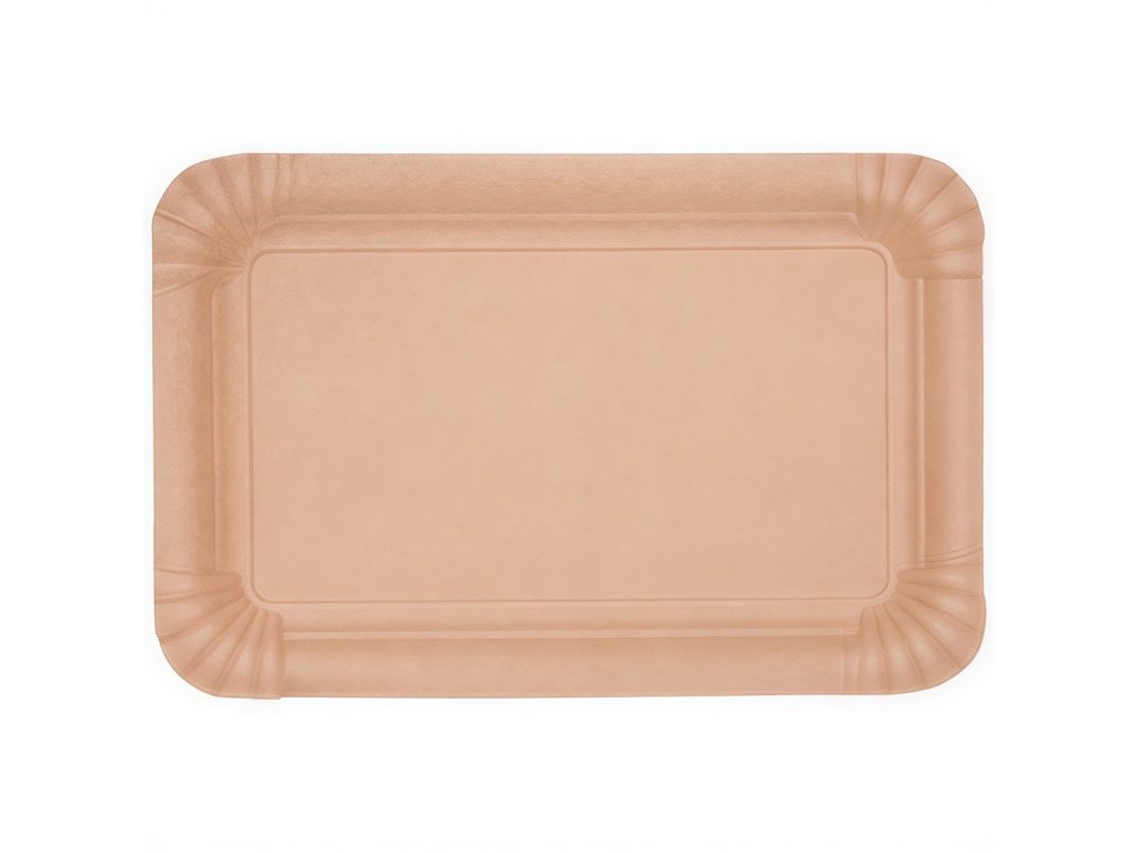 Univerzálne hnedé/kraftové tácky s rozmermi 20 cm x 13 cm, vyrobené zo 100 % recyklovaného papiera.
