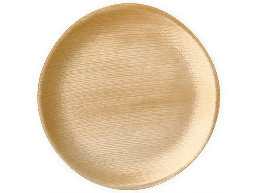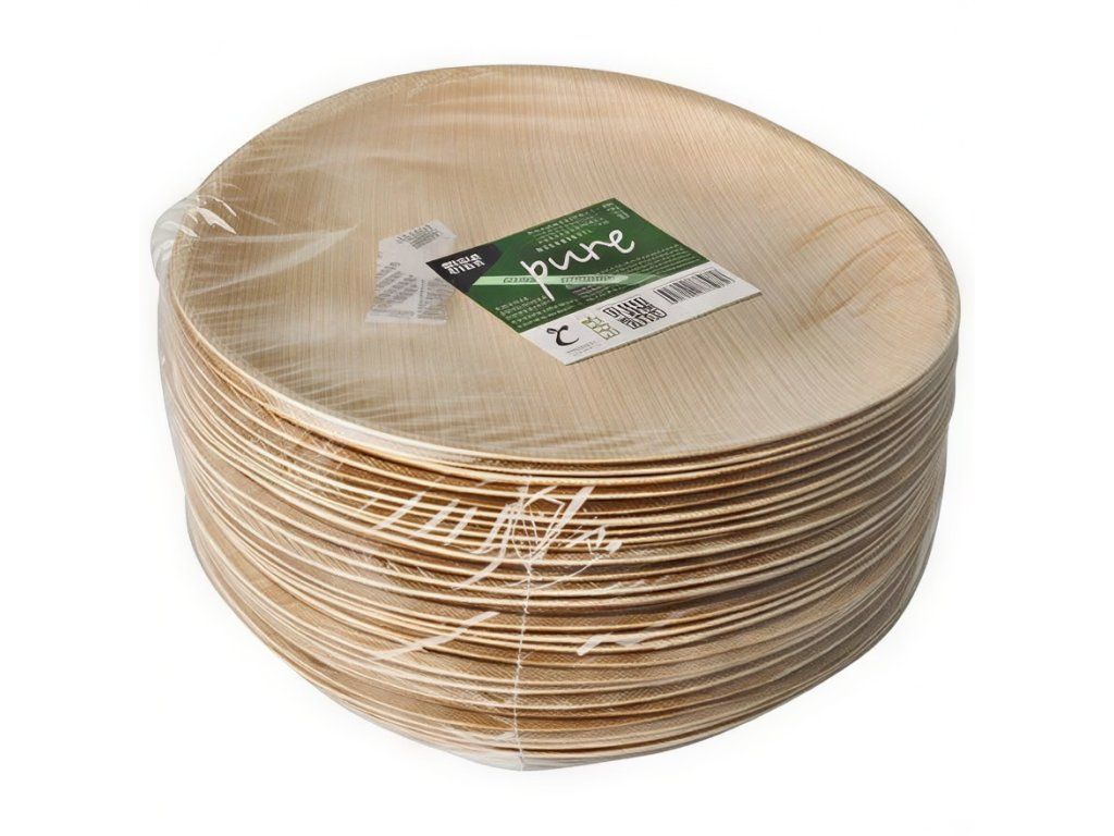 Ekologické okrúhle taniere s priemerom 25 cm a výškou 2 cm. Sú vyrobené výlučne z palmových listov, ktoré sú sušené, čistené a lisované pri vysokej teplote.