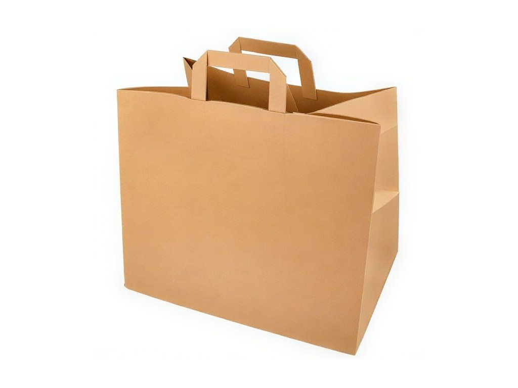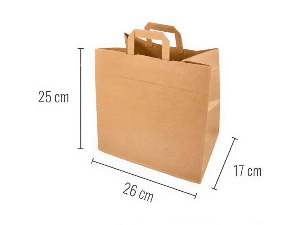 Papierové tašky s rozmermi 26 cm x 17 cm x 25 cm s plochými uchami. Vyrobené zo 100 % papiera.