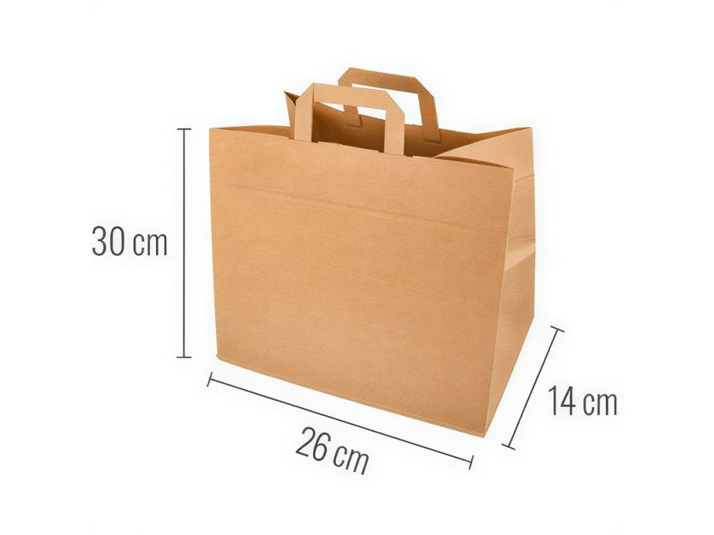 Papierové tašky s rozmermi 26 cm x 14 cm x 30 cm s plochými uchami