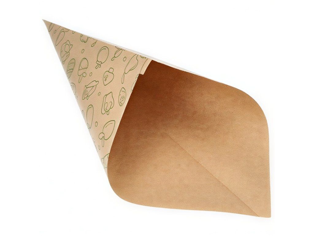 Vrecia v tvare kužeľa s rozmermi 44 cm x 31 cm x 31 cm. Vyrobené zo 100 % mastnotu odolného papiera.