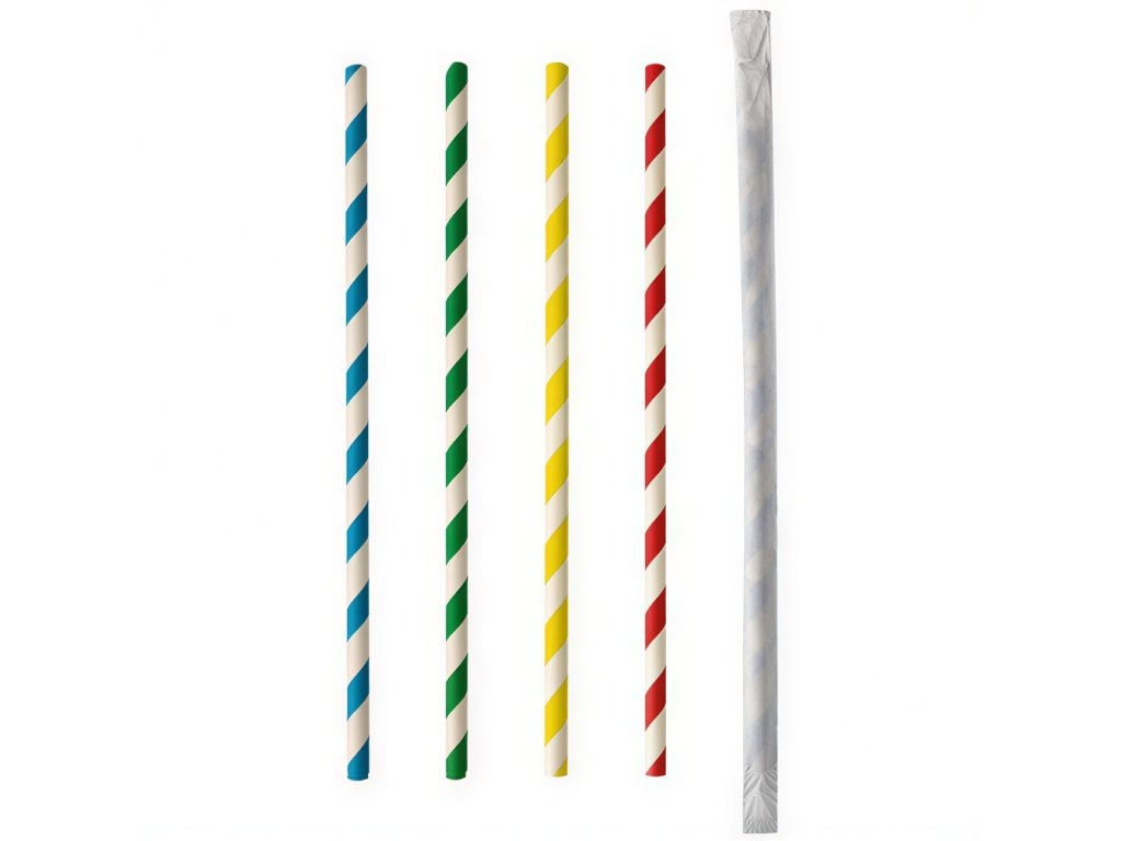 Viacfarebné, papierové, rovné slamky s priemerom 6 mm a dĺžkou 20 cm, balené jednotlivo.