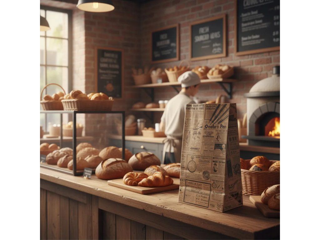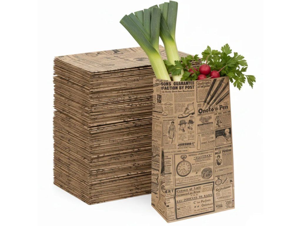 Hnedé papierové tašky s potlačou v štýle starých novín sú praktickým a štýlovým riešením pre stravovacie služby a maloobchod ?️?