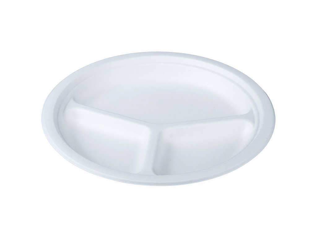 Kruhové, trojdielne taniere s priemerom 26 cm, vyrobené zo 100 % cukrovej trstiny, úplne biologicky rozložiteľného a odolného materiálu s teplotnou odolnosťou až do 220 °C!