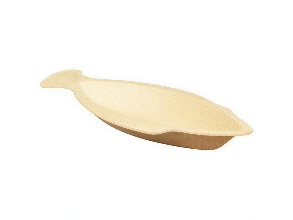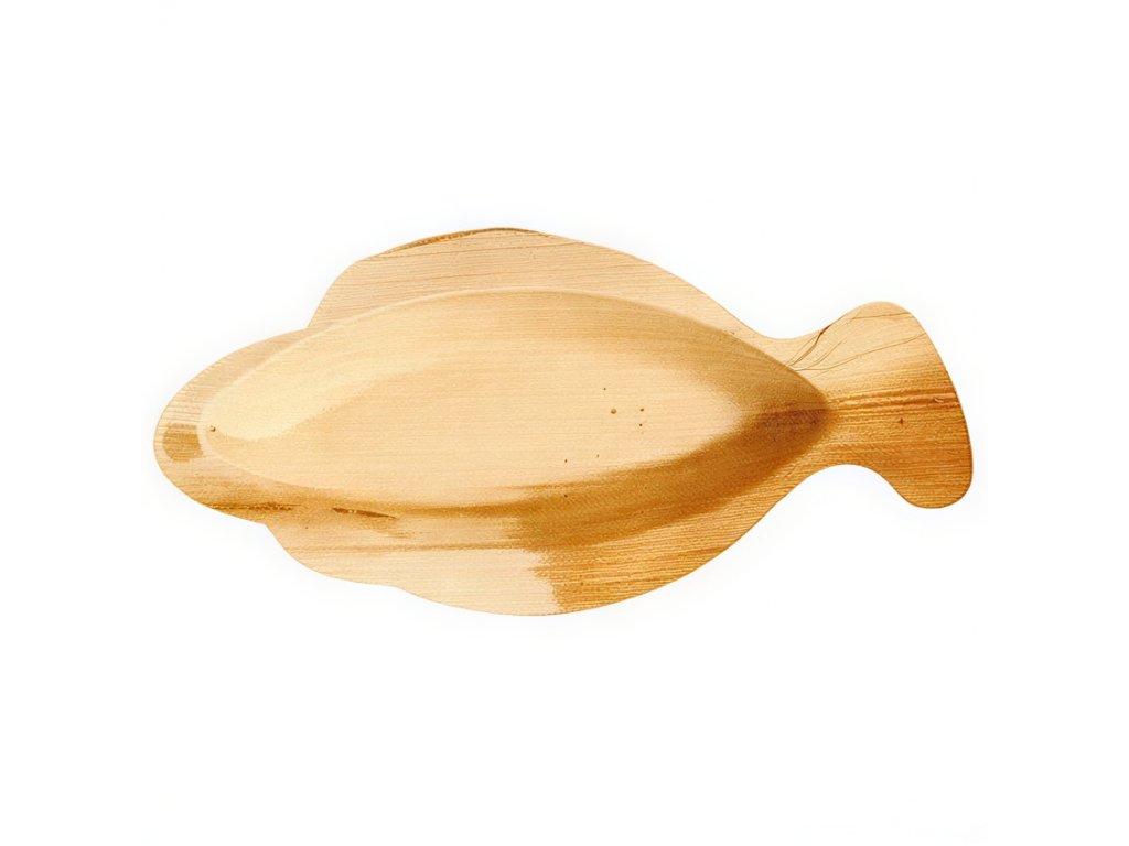 Ekologické taniere v tvare ryby s rozmermi 24 cm x 11 cm x 3 cm. Sú vyrobené výlučne z palmových listov, ktoré sú sušené, čistené a lisované pri vysokých teplotách.