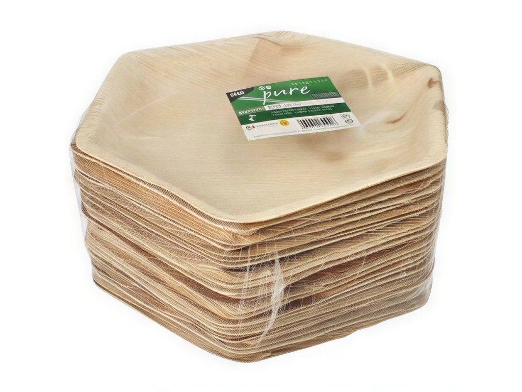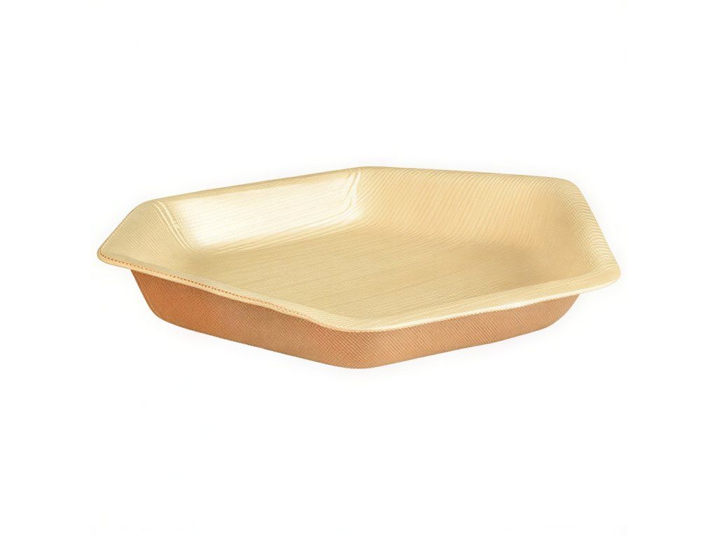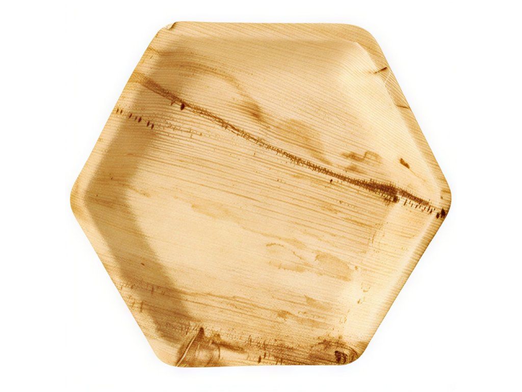 Ekologické šesťuholníkové taniere s rozmermi 23,5 cm x 3 cm. Sú vyrobené výlučne z palmových listov, ktoré sú sušené, čistené a lisované pri vysokých teplotách.