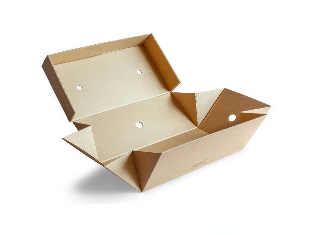 Vyrobené z hrubého, odolného proti vlhkosti kartónu. Otvory v poklopu a bočných stenách umožňujú jedlu „dýchať“.