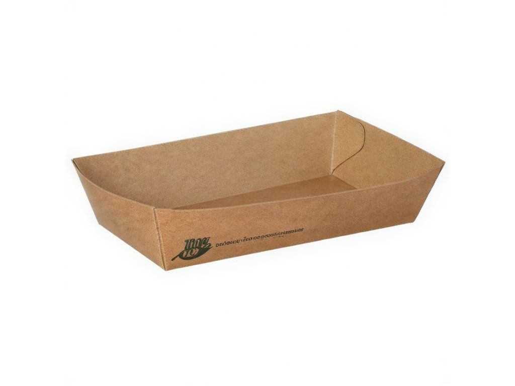 Obdĺžnikové hlboké papierové tácky s rozmermi 15,5 cm x 8,5 cm x 3,5 cm.