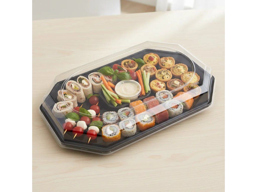 Sú vyrobené z odolného recyklovaného plastu a zabezpečujú bezpečnú a hygienickú prepravu potravín. Perfektne prispôsobený tvar zaručuje bezpečné uzavretie a úplná priehľadnosť umožňuje perfektné zobrazenie obsahu tácky. Súprava tácka + viečko je vynikajúcou voľbou pre cateringové služby, reštaurácie a organizátorov rodinných a firemných podujatí.