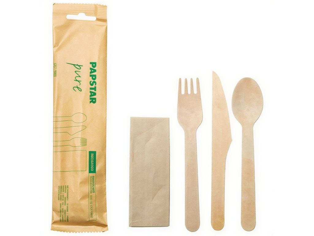 Ekologická drevená sada príborov – vidlička, nôž a lyžica s obrúskom. Vhodná na všetky jedlá – studené aj teplé. Odolná voči teplotám od -20 °C do 85 °C.