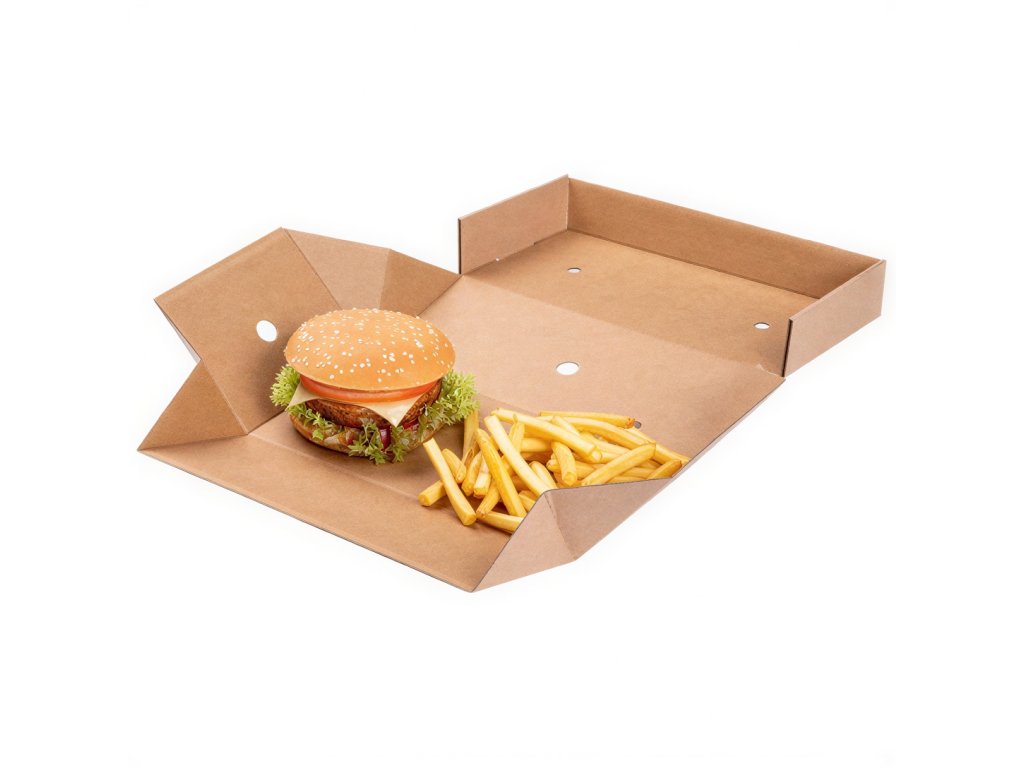 Krabice sú ideálne na servírovanie hamburgerov s prílohami, ako sú hranolky alebo šalát, na cestu. Možnosťou sú aj dva hamburgery!