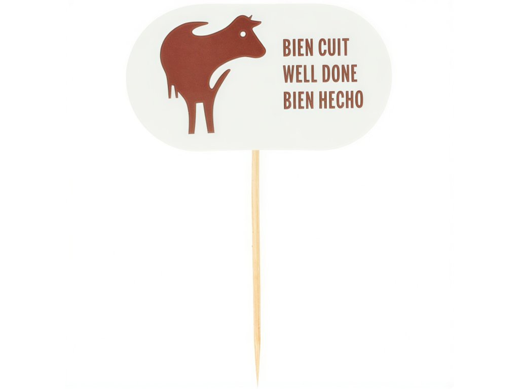 Drevené tyčinky, dĺžka 8 cm, na steaky, s nápisom (v troch jazykoch) informujúcim o stupni prepečenia mäsa „Well Done“.