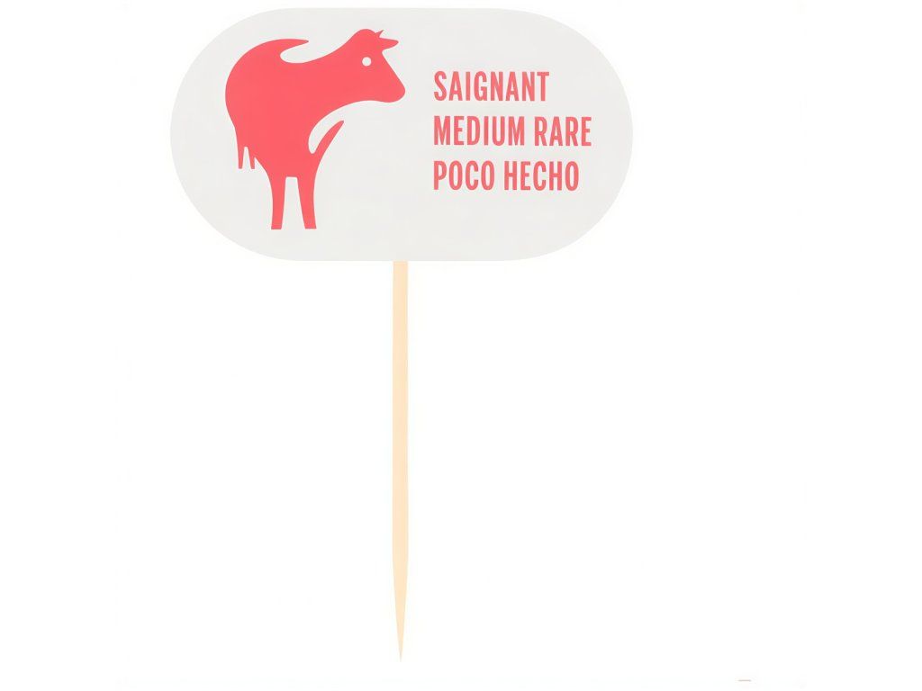 8 cm dlhé drevené tyčinky na steaky s nápisom (v troch jazykoch) informujúcim o stupni prepečenia mäsa „medium rare“.