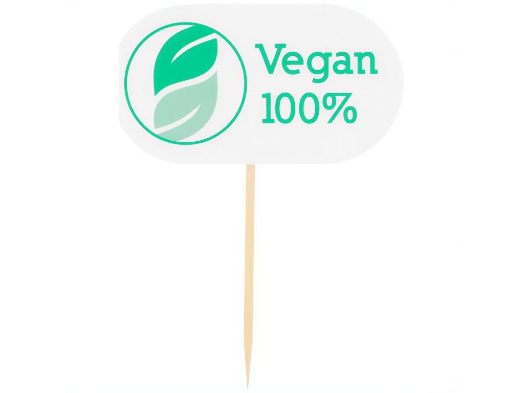 Drevené tyčinky, dĺžka 8 cm, s nápisom „Vegan“. Jednoduchý spôsob, ako označiť vegánske jedlá – vyrobené z produktov, ktoré nie sú živočíšneho pôvodu.
