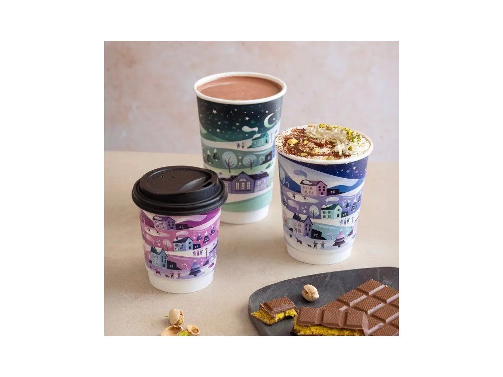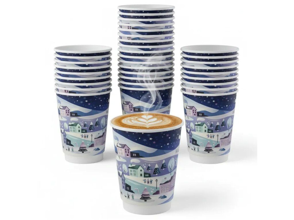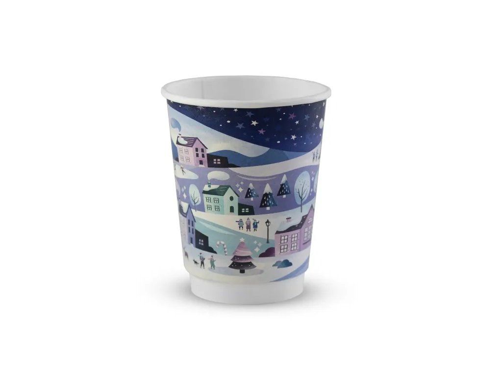 Elegantný vianočný pohár s objemom 350 ml, ideálny na teplé a studené nápoje počas vianočných posedení, osláv alebo podujatí. Vyrobený z dvojvrstvového papiera s PLA vrstvou pre lepšiu tepelnú izoláciu a pohodlie. Vynikajúca voľba pre firmy a jednotlivcov, ktorí si cenia ekológiu – materiál je kompostovateľný v priemyselných podmienkach.